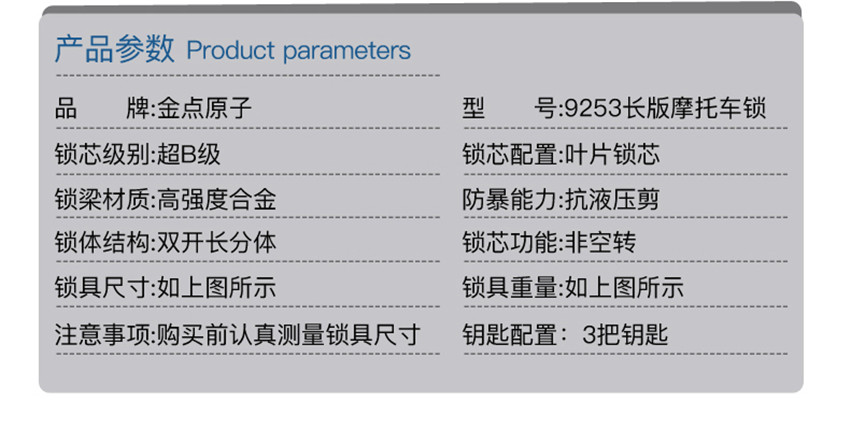 金點(diǎn)原子超B級(jí)葉片鎖芯摩托車鎖 U型加長 電瓶車鎖抗液壓剪防撬